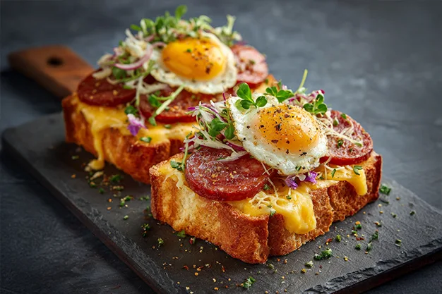 | Rührei | Reife Avocado | Geschmolzener Cheddar-Käse Die perfekte Balance aus pflanzlicher Cremigkeit und einem herzhaften Käse-Finale.A.1, C, G, L | 12 | |