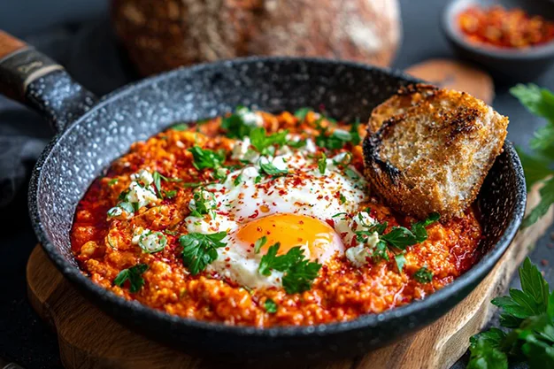 | Menemen | Traditionell türkisches Eiergericht | Tomaten & Paprika (vegetarisch) In der Pfanne cremig verbunden. Der Inbegriff eines ehrlichen Frühstücks.A.1, C, G, L wahlweise: Sucuk 2,5 € oder Rinder Bacon extra 3 € | 11,5 | |